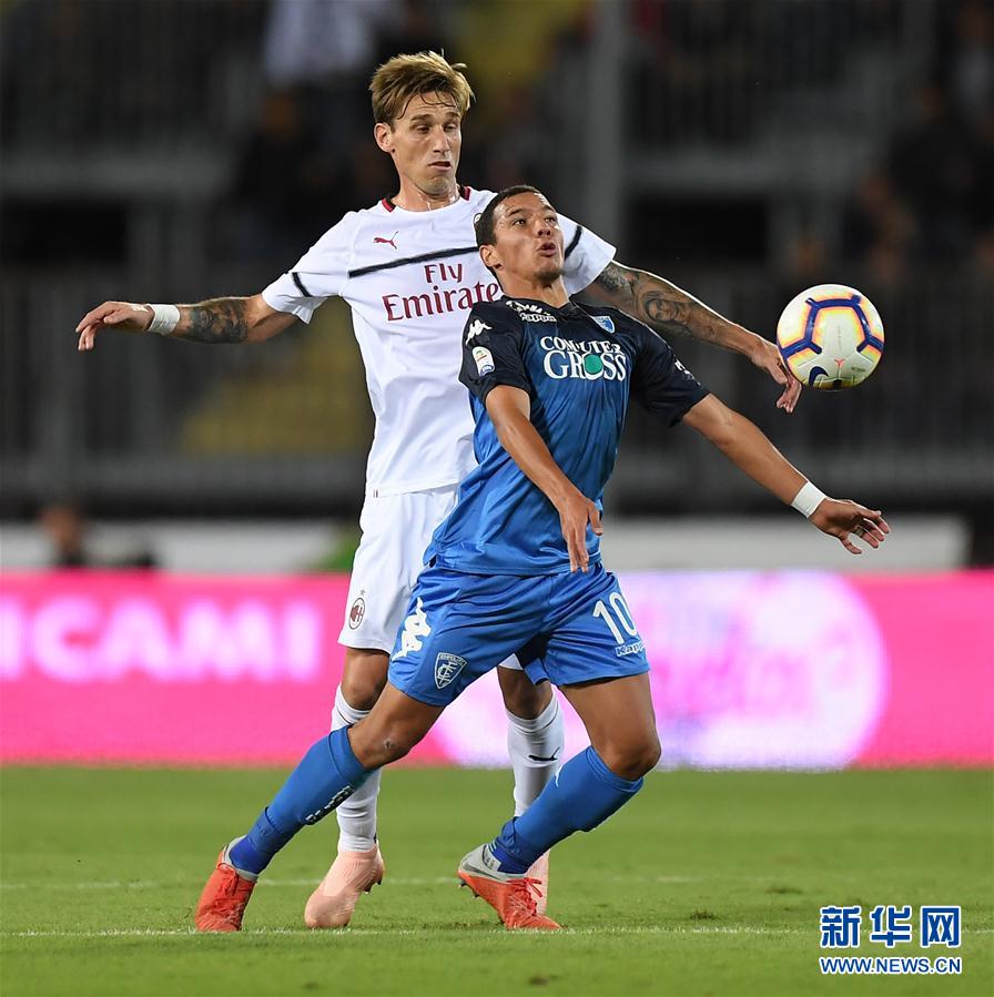 9月27日,AC米兰队球员卢卡斯·比利亚(左)与恩波利队球员伊斯梅尔·贝纳塞在比赛中拼抢。 新华社发(阿尔贝托·林格里亚摄)
