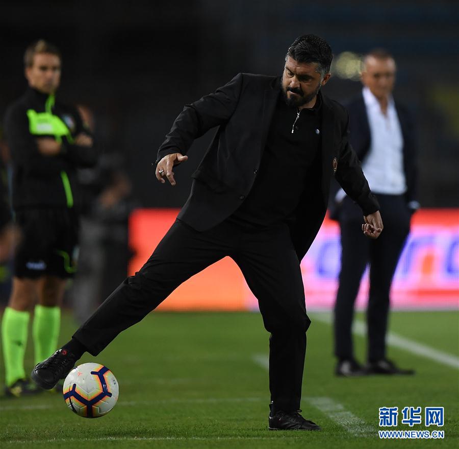 9月27日,AC米兰队主教练加图索在场边踢滚过来的皮球。 新华社发(阿尔贝托·林格里亚摄)