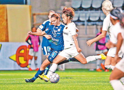 瑞典当地时间10月17日,巴黎圣日耳曼队球员王霜(左三)在比赛中进攻。