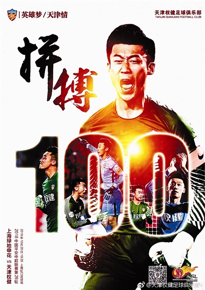 权健队昨日发布了本场与上海绿地申花队比赛的海报,张鹭成为海报的主题,海报上大大的数字“100”提醒着大家本场比赛将是张鹭在权健队的第100次出场。自从2016赛季加盟权健队,张鹭以神勇的表现帮助球队完成冲超等目标,逐渐成为球队不可或缺的队长。张鹭也将成为天津权健队史上首位百场球员。天津权健足球俱乐部通过微博表达了对张鹭的感谢和鼓励。张鹭表示,感谢权健给了他回家乡踢球的机会,也感谢球迷的陪伴,在球队目前保级形势严峻的情况下,自己一定会承担更多的责任,用出色的表现迎接百场秀。