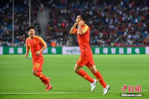 图为中国队球员冯潇霆(右)进球后庆祝。中新社记者 骆云飞 摄