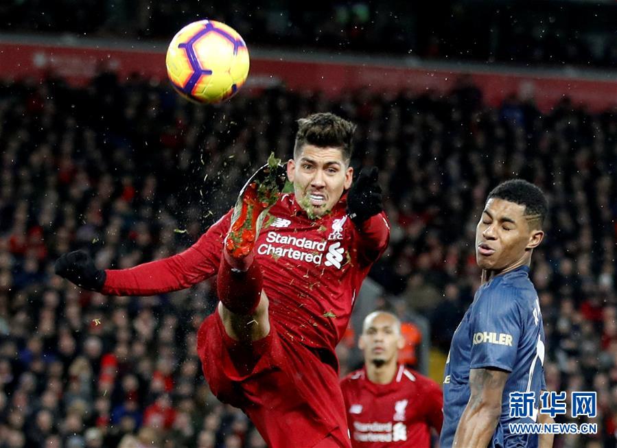 12月16日,利物浦队球员菲尔米诺(左)在比赛中拼抢。 当日,在2018-2019赛季英格兰足球超级联赛第17轮比赛中,利物浦队主场以3比1战胜曼彻斯特联队。 新华社/路透