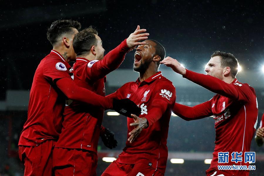 12月16日,利物浦队球员沙奇里(左二)进球后与队友庆祝。 当日,在2018-2019赛季英格兰足球超级联赛第17轮比赛中,利物浦队主场以3比1战胜曼彻斯特联队。 新华社/路透