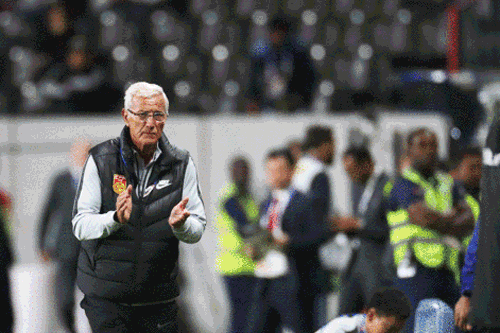 ↑ 中国队主教练里皮(左)在赛后与菲律宾队主教练埃里克森致意。新华社记者曹灿摄。
