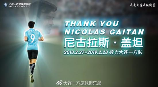 从俱乐部整体规划以及长远发展的角度综合考虑,经与球员本人协商一致,外援尼古拉斯-盖坦加盟美职联芝加哥火焰队。对盖坦效力大连一方时期为球队做出的贡献,俱乐部表示衷心感谢。