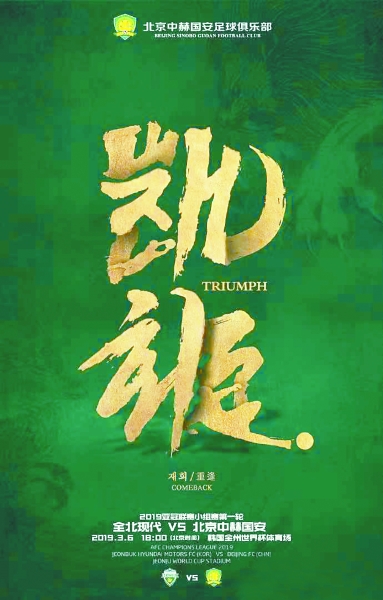 北京时间明晚6时,2019赛季亚冠联赛将进行小组赛首轮角逐,身处G组的北京中赫国安队客战韩国全北现代队。如果说此前与上海上港队的超级杯赛、与武汉卓尔队的中超首轮较量,分别属于季前热身和联赛小试牛刀,那么明晚对垒韩国足坛劲旅全北队的比赛,可谓新赛季的首场硬仗,它将进一步检验国安的强队成色。昨天,国安俱乐部发布了主题为“凯旋”的赛前海报,球队上下都期待从对手的“魔鬼主场”取分。