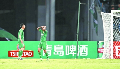 北京国安队球员比埃拉(右)在比赛中被判进球无效