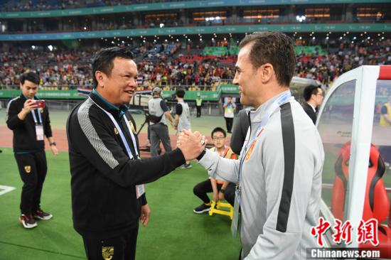 资料图:2019中国杯揭幕战开赛前,泰国队主帅西里萨克-约戴雅德泰与卡纳瓦罗握手。 俞靖 摄