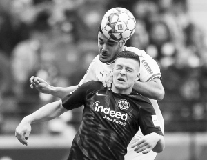图为法兰克福队球员约维奇(前)与斯图加特队球员卡巴克争顶头球。