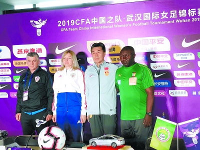 ▲女足四国赛4名主教练在新闻发布会上亮相。 本报记者 刘大伟