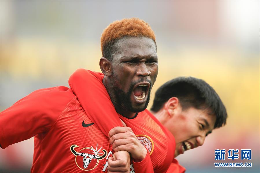 4月20日下午,中超联赛第六轮北京人和主场2比2战平深圳佳兆业,深圳遭遇四轮不胜。北京人和上轮联赛主场爆冷战胜广州恒大,士气正旺。上半场第37分钟,深圳队塞尔纳斯世界波破门,深圳1比0领先。下半场第49分钟,北京人和阿卢科破门扳平比分。第76分钟,迪奥普再下一城帮助北京人和逆转比分。但深圳队没有放弃,第87分钟金强禁区线上射门得分,最终两队2比2战平。 图为北京人和队球员迪奥普(左)在进球后庆祝。 新华社记者丁旭摄