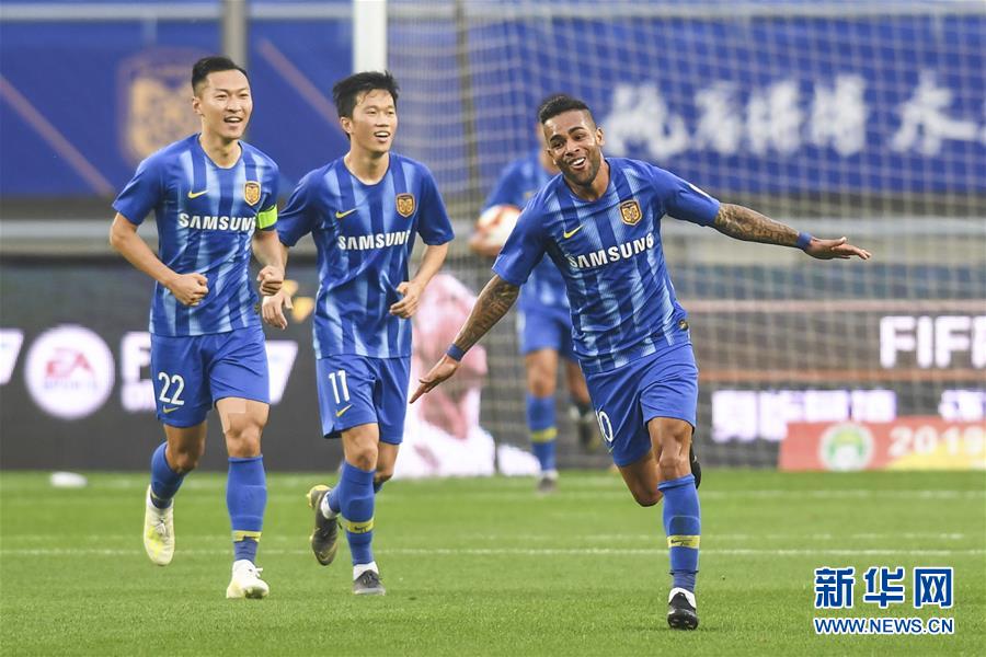 4月21日,中超联赛第六轮江苏苏宁易购队主场迎战广州富力队。开场仅3分钟,主场作战的苏宁就取得了梦幻开局,埃德尔接吴曦头球后蹭轻松破门,为主队取得领先。第13分钟,富力开出角球,无人盯防的托西奇头球破门,为富力扳平比分。此后的比赛完全落入了苏宁的节奏。第20分钟,特谢拉突破至禁区弧顶,一脚射门再度帮助主队领先。仅仅6分钟后,又是特谢拉凭借个人能力建功,他接后场长传球杀入禁区,在多名富力球员的防守下一脚射门打进球门远角,苏宁3比1领先。此后苏宁还有扩大领先的机会,可惜张凌峰晃过富力门将程月磊后的射门偏出。富力在半场结束前也创造了一些机会,但未能改写比分,主队3比1领先结束上半场。 易边再战,富力大举进攻,但并不能制造多少威胁,倒是苏宁在第65分钟再度取得进球,埃德尔接谢鹏飞传球再度破门,比分来到4比1。第85分钟,富力用U23门将韩佳奇换下程月磊,但刚刚登场的韩佳奇随即出现黄油手,第89分钟谢鹏飞禁区外一脚远射,韩佳奇失误送大礼,只能目送皮球入网,比分也最终定格为5比1,苏宁取得了新赛季主场三连胜。 图为江苏苏宁易购队球员特谢拉(右)在比赛中庆祝进球。 新华社记者李博摄