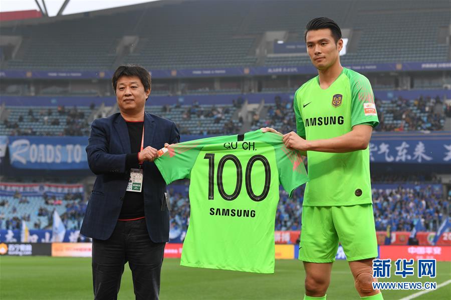 4月21日,中超联赛第六轮江苏苏宁易购队主场迎战广州富力队。开场仅3分钟,主场作战的苏宁就取得了梦幻开局,埃德尔接吴曦头球后蹭轻松破门,为主队取得领先。第13分钟,富力开出角球,无人盯防的托西奇头球破门,为富力扳平比分。此后的比赛完全落入了苏宁的节奏。第20分钟,特谢拉突破至禁区弧顶,一脚射门再度帮助主队领先。仅仅6分钟后,又是特谢拉凭借个人能力建功,他接后场长传球杀入禁区,在多名富力球员的防守下一脚射门打进球门远角,苏宁3比1领先。此后苏宁还有扩大领先的机会,可惜张凌峰晃过富力门将程月磊后的射门偏出。富力在半场结束前也创造了一些机会,但未能改写比分,主队3比1领先结束上半场。 易边再战,富力大举进攻,但并不能制造多少威胁,倒是苏宁在第65分钟再度取得进球,埃德尔接谢鹏飞传球再度破门,比分来到4比1。第85分钟,富力用U23门将韩佳奇换下程月磊,但刚刚登场的韩佳奇随即出现黄油手,第89分钟谢鹏飞禁区外一脚远射,韩佳奇失误送大礼,只能目送皮球入网,比分也最终定格为5比1,苏宁取得了新赛季主场三连胜。 图为江苏苏宁易购队守门员顾超(右)赛前收到代表该队出场百场比赛的纪念球衣。 新华社记者李博摄