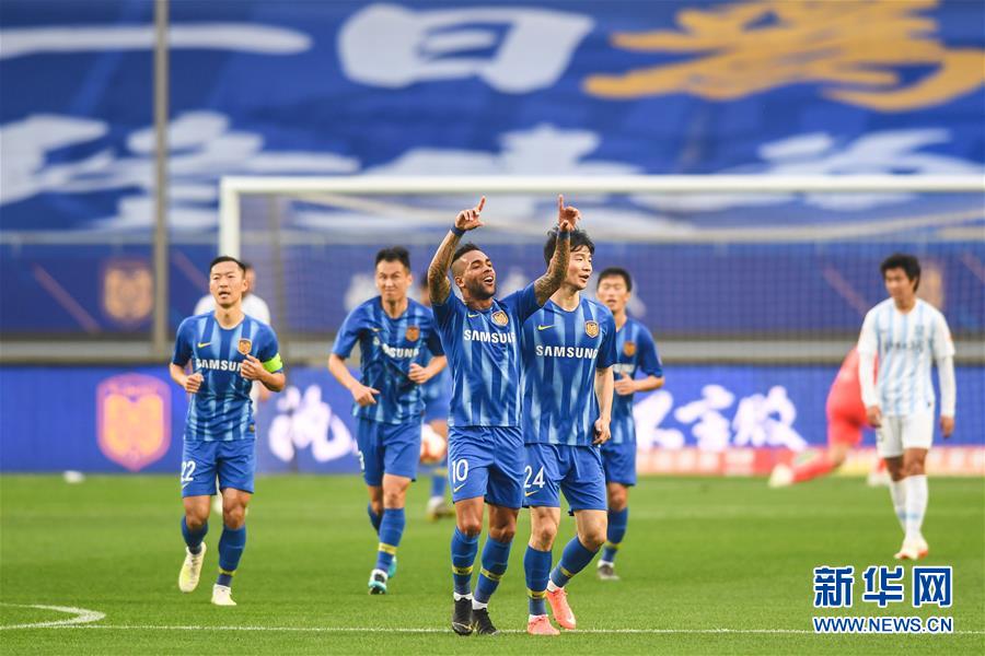 4月21日,中超联赛第六轮江苏苏宁易购队主场迎战广州富力队。开场仅3分钟,主场作战的苏宁就取得了梦幻开局,埃德尔接吴曦头球后蹭轻松破门,为主队取得领先。第13分钟,富力开出角球,无人盯防的托西奇头球破门,为富力扳平比分。此后的比赛完全落入了苏宁的节奏。第20分钟,特谢拉突破至禁区弧顶,一脚射门再度帮助主队领先。仅仅6分钟后,又是特谢拉凭借个人能力建功,他接后场长传球杀入禁区,在多名富力球员的防守下一脚射门打进球门远角,苏宁3比1领先。此后苏宁还有扩大领先的机会,可惜张凌峰晃过富力门将程月磊后的射门偏出。富力在半场结束前也创造了一些机会,但未能改写比分,主队3比1领先结束上半场。 易边再战,富力大举进攻,但并不能制造多少威胁,倒是苏宁在第65分钟再度取得进球,埃德尔接谢鹏飞传球再度破门,比分来到4比1。第85分钟,富力用U23门将韩佳奇换下程月磊,但刚刚登场的韩佳奇随即出现黄油手,第89分钟谢鹏飞禁区外一脚远射,韩佳奇失误送大礼,只能目送皮球入网,比分也最终定格为5比1,苏宁取得了新赛季主场三连胜。 图为江苏苏宁易购队球员特谢拉(前左)在比赛中庆祝进球。 新华社记者李博摄