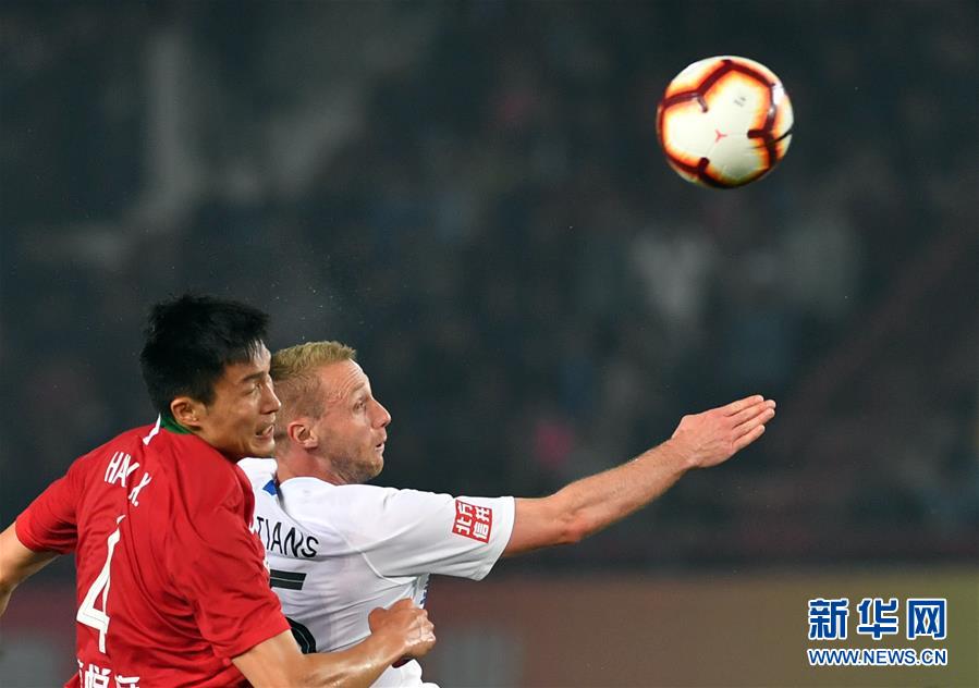 4月20日,中超联赛第六轮河南建业主场迎战天津泰达。上半场,泰达球员郑凯木头球两度建功,帮助天津队2比0领先。第13分钟,买提江开出角球,郑凯木力压防守队员头球破门。伤停补时阶段,相似的情节再次上演,郑凯木接买提江发出的前场定位球,头球再度破门。 易边再战,河南建业连追两球。第47分钟,奥汉德扎禁区内打门被挡出,建业队员周定洋禁区弧顶前抽射破门。第57分钟,奥汉德扎禁区内突破被门将绊倒,河南建业队获得点球,奥汉德扎一蹴而就将比分扳平。第75分钟,天津泰达外援阿奇姆彭上演“千里走单骑”,中场断球后连过河南建业4名防守队员,面对门将冷静推射得手,将本场比赛最终比分锁定为3比2。 图为河南建业队球员韩轩(左)在比赛中与天津泰达队球员巴斯蒂安斯争顶头球。 新华社记者李嘉南摄