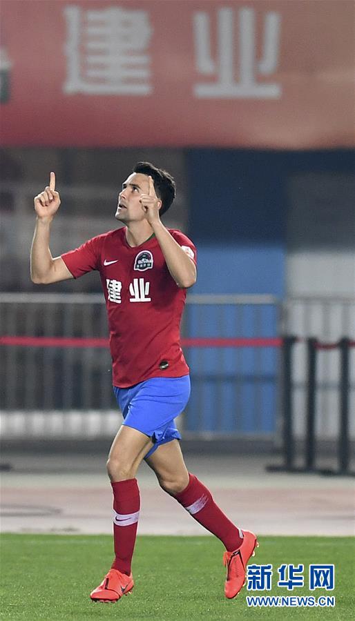 4月20日,中超联赛第六轮河南建业主场迎战天津泰达。上半场,泰达球员郑凯木头球两度建功,帮助天津队2比0领先。第13分钟,买提江开出角球,郑凯木力压防守队员头球破门。伤停补时阶段,相似的情节再次上演,郑凯木接买提江发出的前场定位球,头球再度破门。 易边再战,河南建业连追两球。第47分钟,奥汉德扎禁区内打门被挡出,建业队员周定洋禁区弧顶前抽射破门。第57分钟,奥汉德扎禁区内突破被门将绊倒,河南建业队获得点球,奥汉德扎一蹴而就将比分扳平。第75分钟,天津泰达外援阿奇姆彭上演“千里走单骑”,中场断球后连过河南建业4名防守队员,面对门将冷静推射得手,将本场比赛最终比分锁定为3比2。 图为河南建业队球员周定洋在比赛中庆祝进球。 新华社记者李嘉南摄