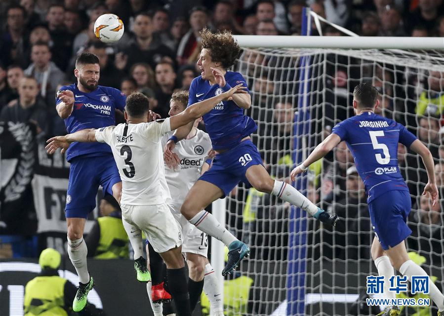 5月9日,切尔西队球员吉鲁(上左)、队友大卫·路易斯(上右)在比赛中。 当日,在英国伦敦斯坦福桥球场进行的2018/2019赛季欧罗巴联赛半决赛第二回合比赛中,英超切尔西队主场在120分钟内与德甲法兰克福队以1比1战平,双方两回合总比分战成2比2平。最终,通过点球大战,切尔西队以4比3获胜,晋级欧罗巴联赛决赛。 新华社记者韩岩摄
