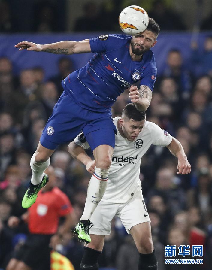 5月9日,切尔西队球员吉鲁(上)与法兰克福队球员约维奇在比赛中争顶。 当日,在英国伦敦斯坦福桥球场进行的2018/2019赛季欧罗巴联赛半决赛第二回合比赛中,英超切尔西队主场在120分钟内与德甲法兰克福队以1比1战平,双方两回合总比分战成2比2平。最终,通过点球大战,切尔西队以4比3获胜,晋级欧罗巴联赛决赛。 新华社记者韩岩摄
