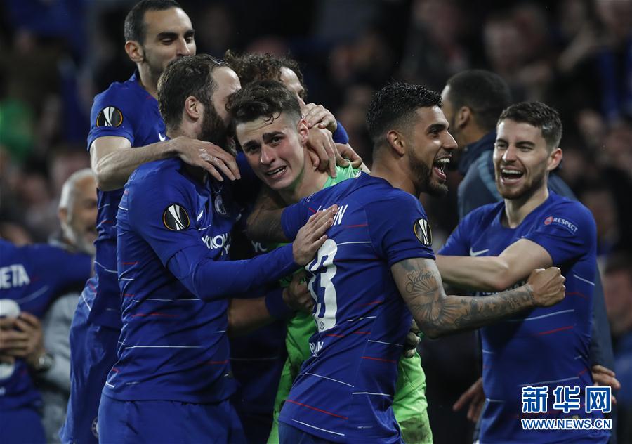5月9日,扑出两粒点球的功臣、切尔西队门将凯帕(中)在获胜后与队友庆祝。 当日,在英国伦敦斯坦福桥球场进行的2018/2019赛季欧罗巴联赛半决赛第二回合比赛中,英超切尔西队主场在120分钟内与德甲法兰克福队以1比1战平,双方两回合总比分战成2比2平。最终,通过点球大战,切尔西队以4比3获胜,晋级欧罗巴联赛决赛。 新华社记者韩岩摄