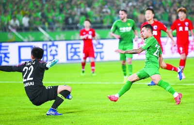 昨天晚上,中超联赛第10轮北京中赫国安主场战胜天津天海,取得赛季开局十连胜。图为下半场入籍球员李可门前推射,打入国安队第二个进球。