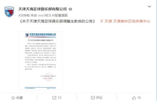 天津天海队在官微宣布了沈祥福离任的消息。图片来源:微博截图