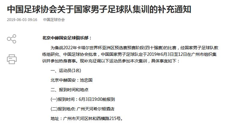中新网6月3日电 3日上午,中国足协官方发布《中国足球协会关于国家男子足球队集训的补充通知》,宣布补招北京中赫国安球员池忠国进入国家队。