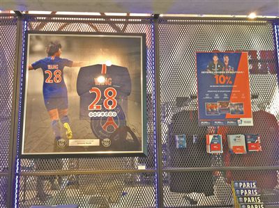 球场旁边是巴黎圣日耳曼俱乐部的特许商品经营店和文化展示大厅,墙上随处可见内马尔、姆巴佩等顶级球星的海报和球衣,视觉冲击力相当强劲。