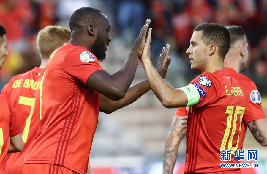 6月8日,比利时队球员卢卡库(左)与阿扎尔在比赛中庆祝。 当日,在比利时布鲁塞尔举行的2020欧洲足球锦标赛预选赛I组比赛中,比利时队主场以3比0战胜哈萨克斯坦队。 新华社/法新