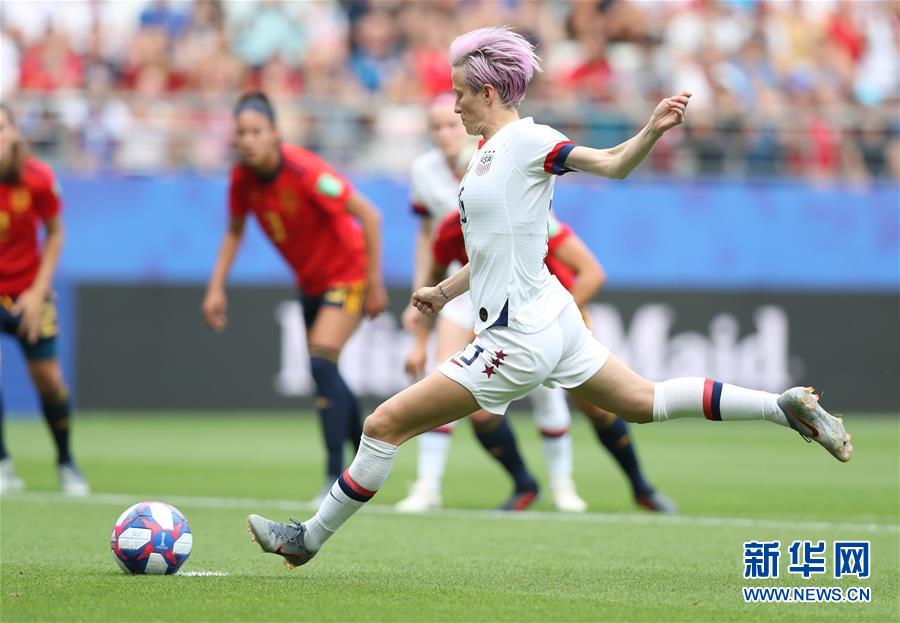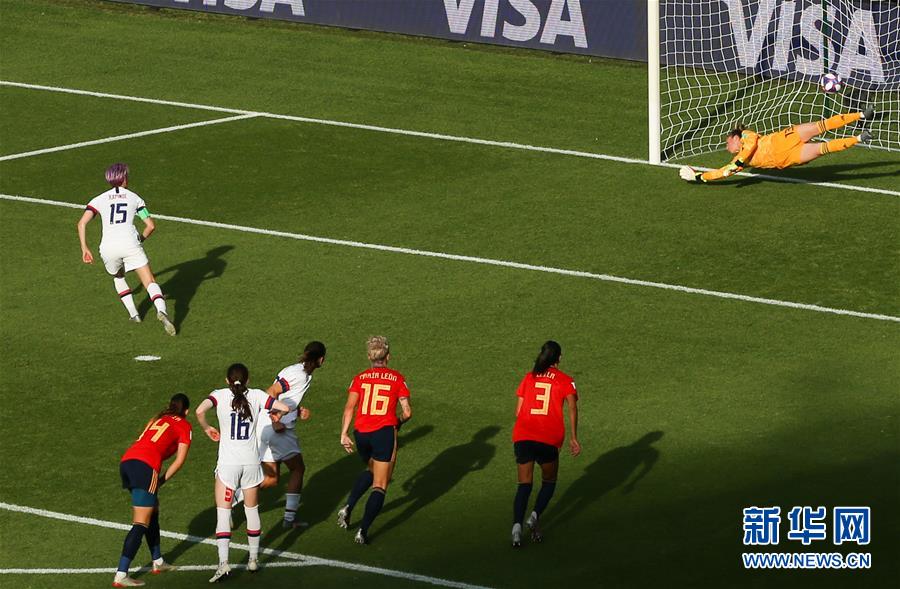 6月24日,美国队球员拉皮诺(左上)在比赛中罚中第二粒点球。 当日,在法国兰斯举行的2019年国际足联女足世界杯16强赛中,美国队以2比1淘汰西班牙队,晋级八强。 新华社记者郑焕松摄