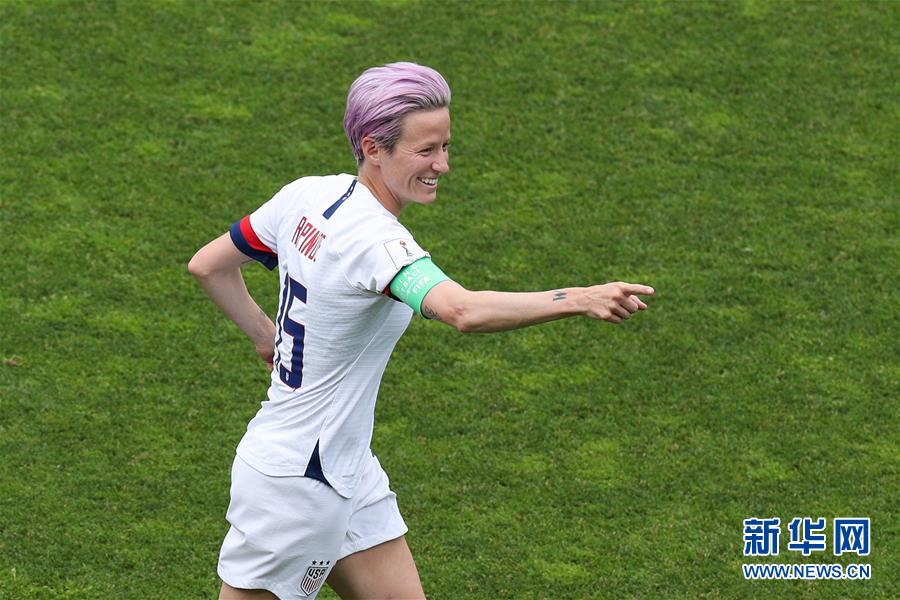 6月24日,美国队球员拉皮诺在比赛中庆祝罚中首粒点球。 当日,在法国兰斯举行的2019年国际足联女足世界杯16强赛中,美国队以2比1淘汰西班牙队,晋级八强。 新华社记者郑焕松摄