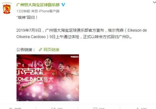 “埃尔克森表示,他将一如既往竭尽全力协助广州队在亚冠和中超赛场再创辉煌。我们相信,埃尔克森的回归将进一步夯实球队的阵容厚度,提升球队的整体实力,他将为广大球迷继续奉献精彩的比赛,为中国足球作出新的更大的贡献!”广州恒大如是写道。