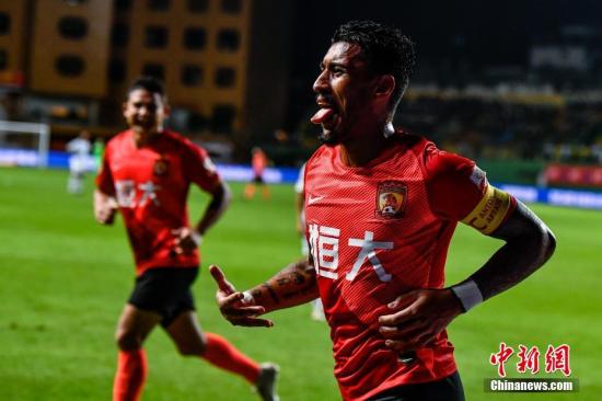 资料图:广州恒大淘宝队球员保利尼奥在比赛中进球后吐舌头庆祝。中新社记者 陈骥旻 摄