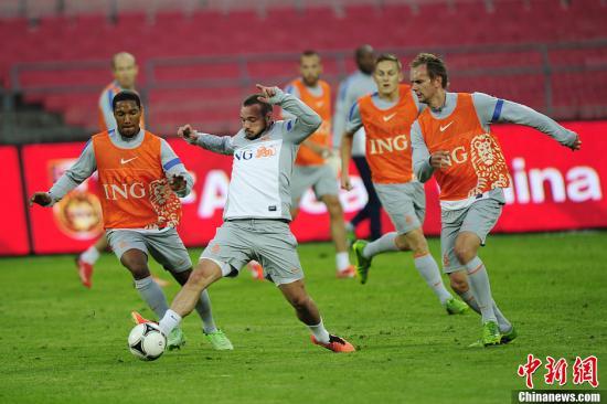 资料图:效力荷兰队期间,斯内德(白)在训练中拼抢。中新社发 崔楠 摄