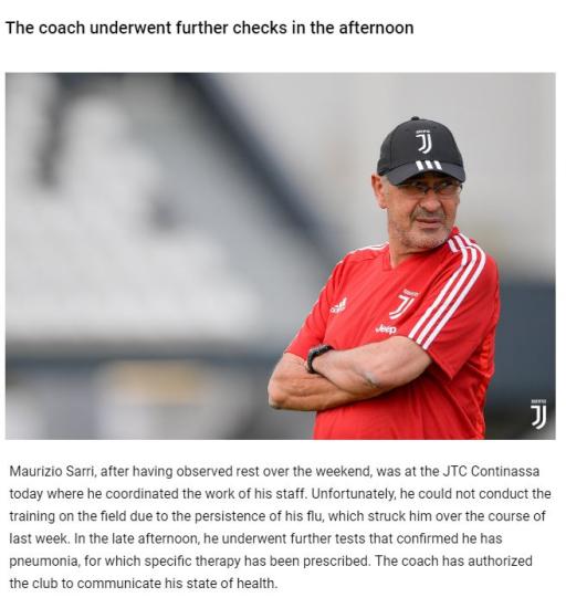 “在观察了周末的休息之后,毛里齐奥•萨里今天来到了尤文的训练中心,在那里他协调了员工们的工作。不幸的是,由于持续不断的流感,他无法在球场上进行训练。下午晚些时候,他接受了进一步的检查,证实他患有肺炎,医生已经为他开出了具体的治疗方案。教练已授权俱乐部通报他的健康状况。”尤文图斯如是写道