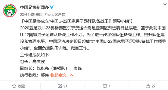 据微博内容,2020亚足联U-23锦标赛暨东京奥运会男足亚洲区预选赛日益临近,鉴于此前中国U-22国家男子足球队备战工作不力,为进一步加强队伍备战工作,提升队伍建设和管理水平,中国足协决定即日起成立“中国U-22国家男子足球队备战工作领导小组”,全面负责队伍训练、竞赛工作。