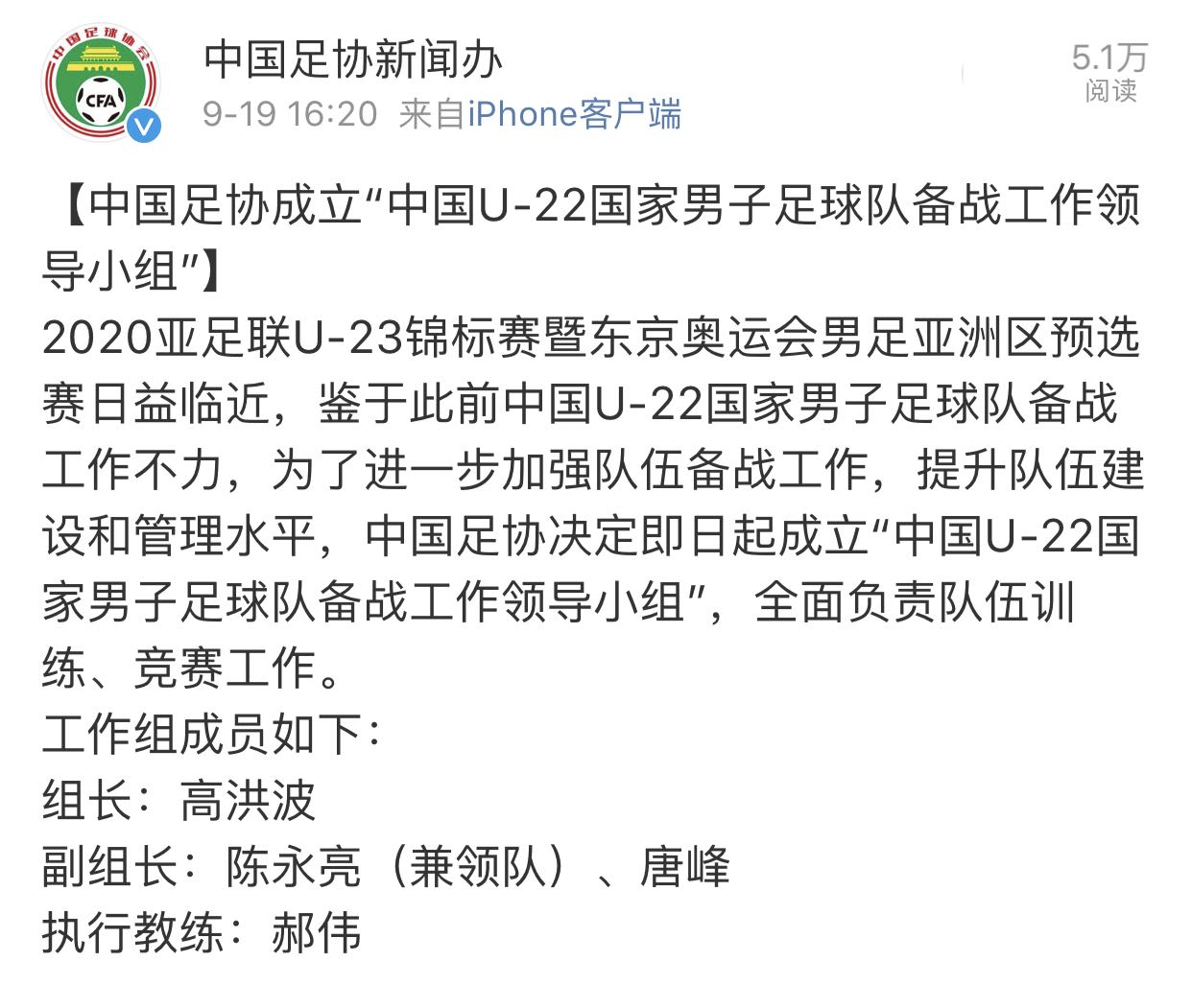 在名为《中国足协成立“中国U-22国家男子足球队备战工作领导小组”》公告中,足协写道:“2020亚足联U-23锦标赛暨东京奥运会男足亚洲区预选赛日益临近,鉴于此前中国U-22国家男子足球队备战工作不力,为了进一步加强队伍备战工作,提升队伍建设和管理水平,中国足协决定即日起成立‘中国U-22国家男子足球队备战工作领导小组’,全面负责队伍训练、竞赛工作。”