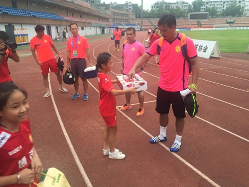 2017中国足球协会业余联赛大区赛赛后给自己教练赠送礼物的小队员。张安琪 摄
