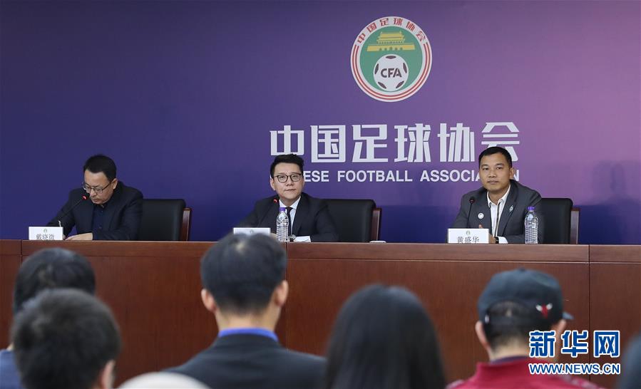 10月16日,中国足协秘书长刘奕(中)、职业联盟筹备组召集人黄盛华(右)和中国足协执委戴晓微在发布会上。 当日,中国足协在北京召开新闻发布会,介绍职业联盟筹备情况。 新华社记者曹灿摄