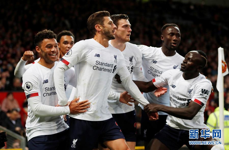 10月20日,利物浦队球员拉拉纳(左三)在进球后和队友庆祝。 当日,在2019-2020赛季英超联赛第九轮比赛中,曼联队主场以1比1战平利物浦队。 新华社/路透