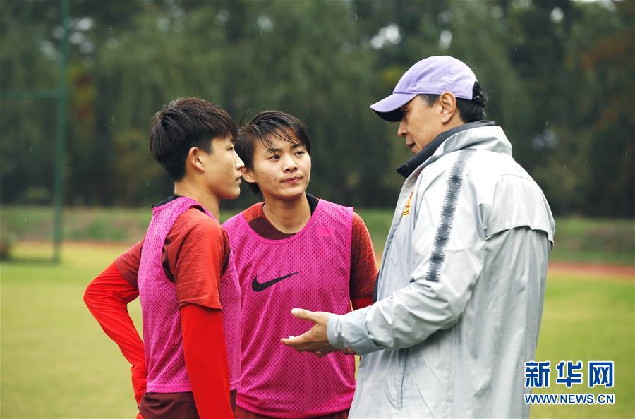 10月24日,中国女足主教练贾秀全(右)在对抗赛前指导队员王霜(中)、庞丰月。 近期,中国国家女子足球队在香河国家足球训练基地进行第二阶段集训,备战11月在重庆举行的永川四国赛,以及明年2月份开始的东京奥运会预选赛。 新华社记者 丁旭 摄
