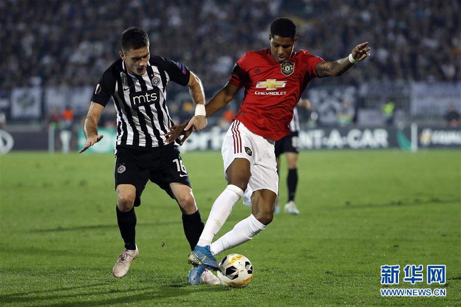 10月24日,曼联队球员马夏尔(右)在比赛中和贝尔格莱德游击球员兹杰拉尔拼抢。 当日,在2019-2020赛季欧罗巴联赛L组比赛中,英超球队曼联客场以1比0战胜塞尔维亚贝尔格莱德游击。 新华社发(普雷德拉格·米洛萨夫列维奇摄)