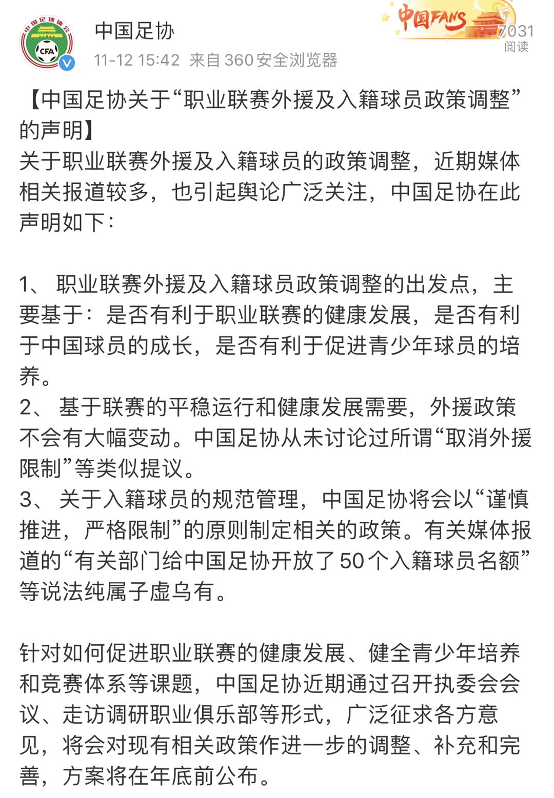 关于职业联赛外援及入籍球员的政策调整,近期媒体相关报道较多,也引起舆论广泛关注,中国足协在此声明如下: