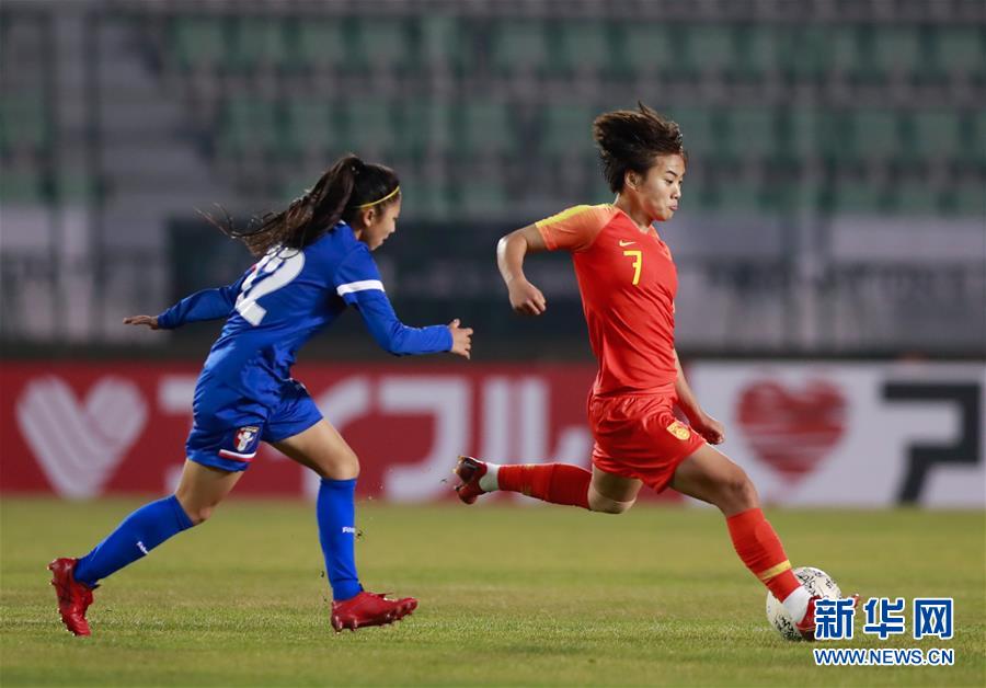 12月17日,中国队球员王霜(右)与中国台北队球员张季兰在比赛中拼抢。 当日,在韩国釜山举行的2019东亚杯女足比赛中,中国队以1比0战胜中国台北队。 新华社记者王婧嫱摄