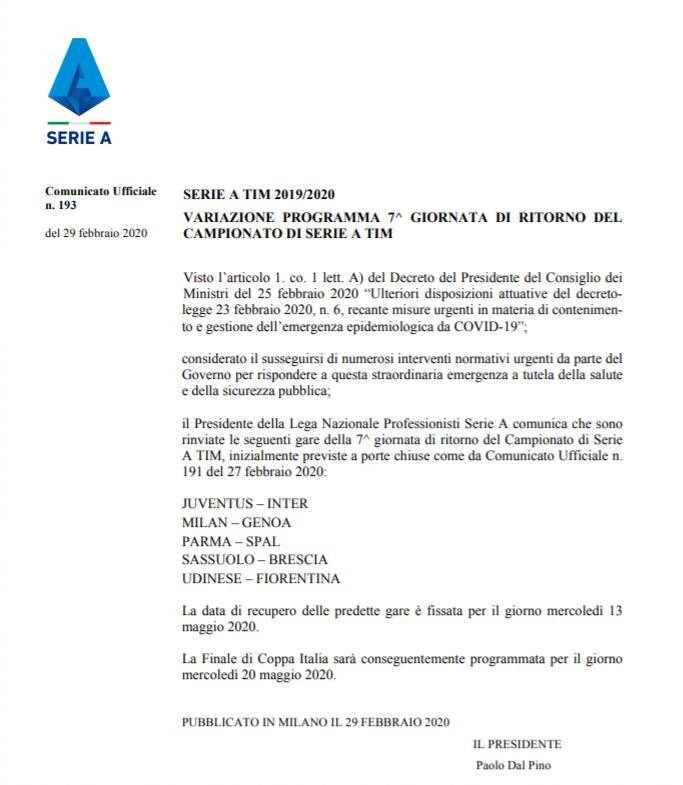 在推迟比赛之前,这些比赛已经确认将空场进行,但现在为了保险起见,意甲还是决定将这5场比赛推迟至5月13日。