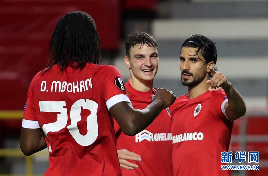 10月29日,安特卫普队球员拉斐洛夫(右)与队友庆祝进球。 当日,在2020-2021赛季欧罗巴联赛小组赛J组第二轮的一场比赛中,英超托特纳姆热刺队客场以0比1不敌比甲安特卫普队。 新华社/路透