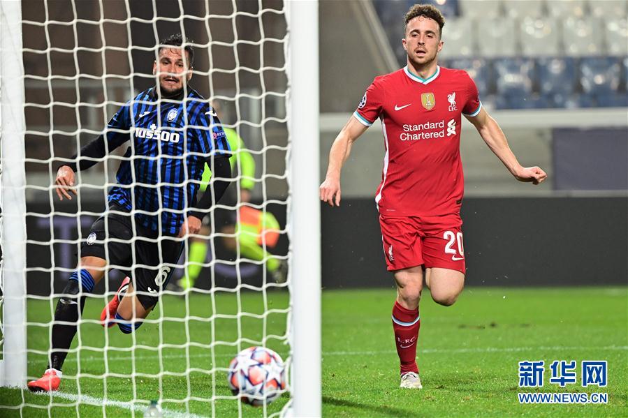 11月3日,利物浦队球员若塔(右)在比赛中破门得分。 当日,在2020-2021赛季欧冠联赛小组赛D组第三轮比赛中,英超利物浦队客场以5比0战胜意甲亚特兰大队。 新华社/法新