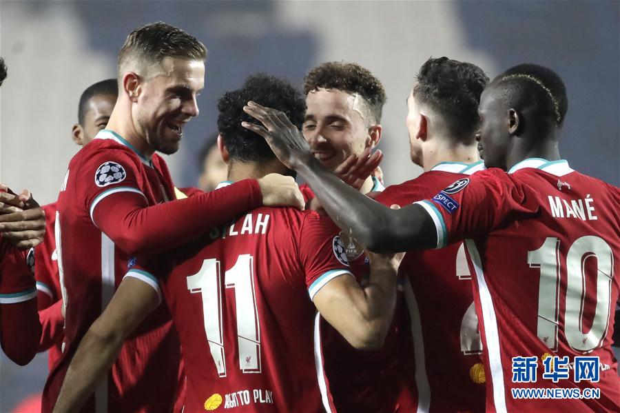 11月3日,利物浦队球员萨拉赫(左二)与队友庆祝进球。 当日,在2020-2021赛季欧冠联赛小组赛D组第三轮比赛中,英超利物浦队客场以5比0战胜意甲亚特兰大队。 新华社/美联