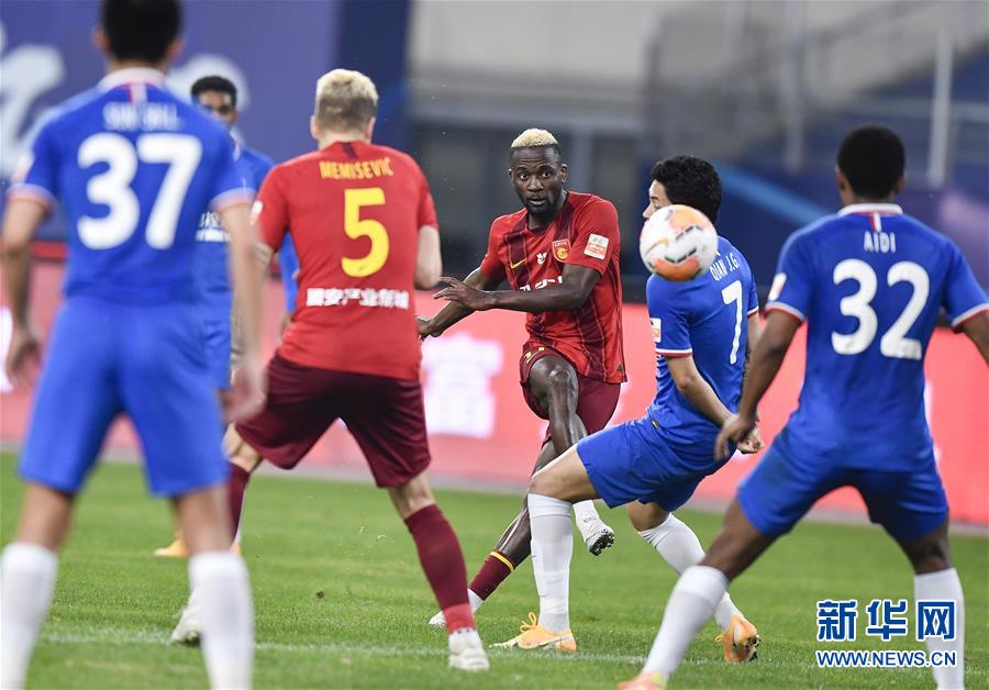 11月6日,河北华夏幸福队球员图雷(中)在比赛中射门。 当日,在2020赛季中国足球协会超级联赛(苏州赛区)第19轮比赛中,河北华夏幸福队以1比4不敌上海绿地申花队。 新华社记者 许畅 摄