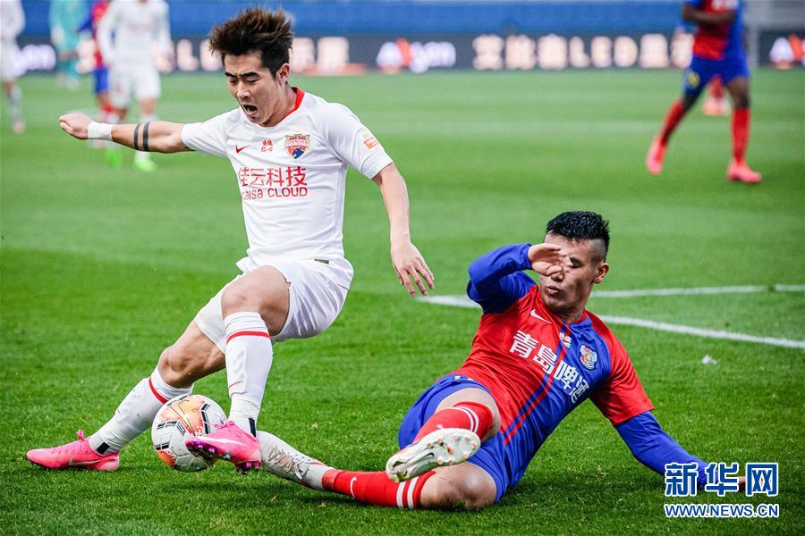 11月6日,深圳佳兆业队球员郑达伦(左)在比赛中带球突破。 当日,在2020赛季中国足球协会超级联赛(大连赛区)第19轮比赛中,深圳佳兆业队以2比0战胜青岛黄海青港队。 新华社发(黎江文摄)