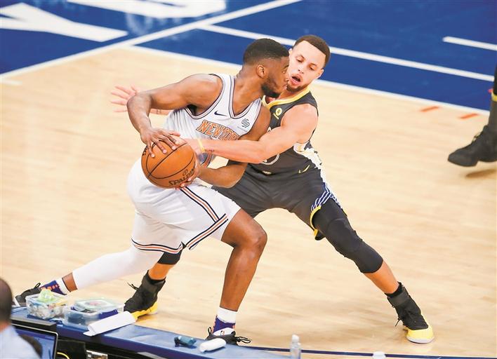 勇士队球员库里(右)在比赛中防守尼克斯队球员穆迪埃。
